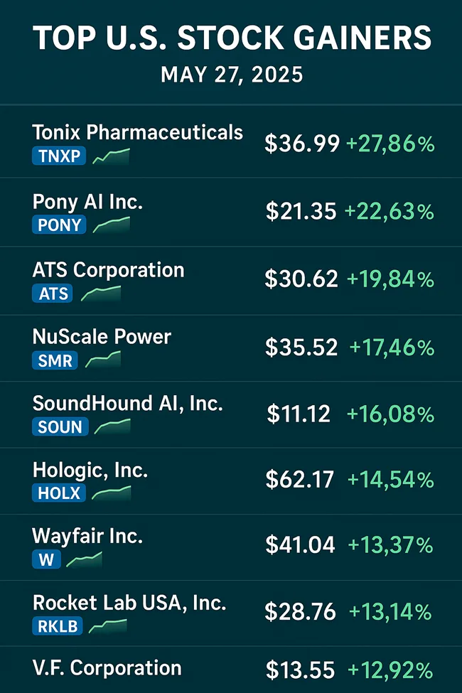 Tonix, NuScale, and Pony AI lead U.S. gainers on May 27: AI, biotech, and energy stocks drive speculative rally